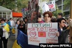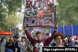 В воскресенье, 27 сентября, накануне выступления Президента России Владимира Путина в Генеральной ассамблее Организации Объединенных Наций неподалеку от здания ООН прошла акция протеста против приезда российского лидера в Нью-Йорк и его агрессивной внешней политики.