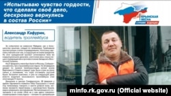 На фотовыставке представлена и история симферопольского водителя троллейбуса Александра Кафурина. Он рассказывает, что 27 февраля 2014 года хотел улететь в Москву – работать в троллейбусном парке. Но на митинге 26 февраля у крымского парламента встретил знакомых и на следующий день стал «ополченцем» девятой роты. Кафурин говорит, что был одним из тех, кто встречал в центре Симферополя народного депутата Украины (на тот момент) Петра Порошенко.