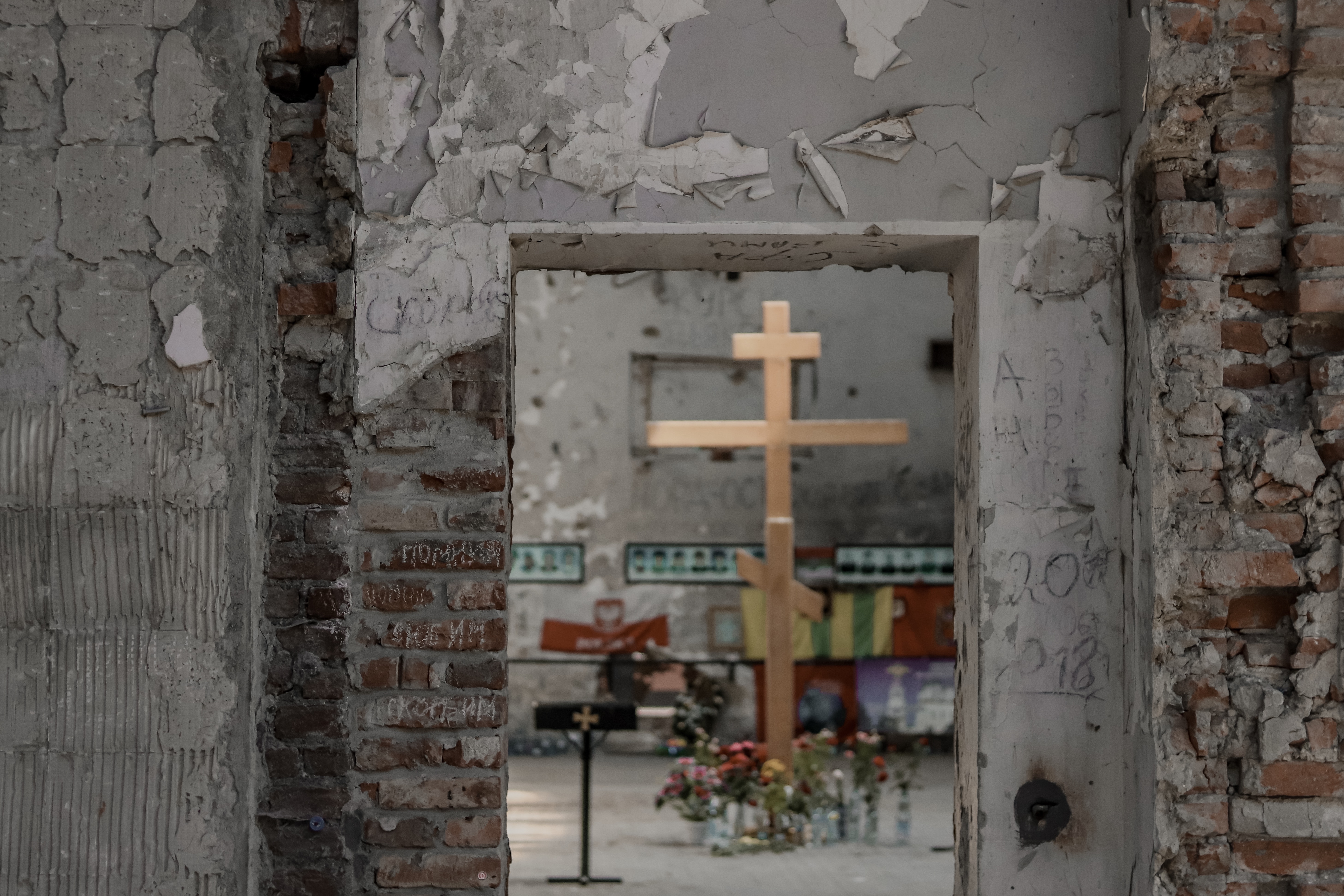 Надписи и пулевые отверстия на стене бывшей школы №1