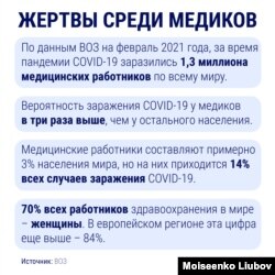 Одной из самых уязвимых для инфекции групп оказались медики – люди, которые работают на передовой борьбы с COVID-19. По подсчетам ВОЗ, с начала пандемии новой инфекцией заразились более миллиона медицинских работников. В организации отметили, что доля заболевающих среди них непропорционально высока: на долю медиков приходится 14% всех случаев заражения (при том, что лишь 3% мирового населения работают в сфере здравоохранения).