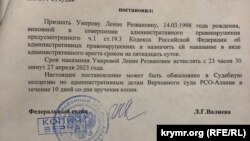 Судья Лали Валиева, рассмотрев эти рапорта, и несмотря на «неустановленную» личность, признала Ление Умерову виновной, и ссылаясь на «неоднократность» административных правонарушений, якобы совершенных ею, вынесла ей наказание в виде очередного ареста на 15 суток. Таким образом, прежний арест Умеровой, наложенный тем же Советским районным судом Владикавказа, истекает 27 апреля в 23 часа 30 минут, а новый срок судья постановила исчислять с 23 часов 30 минут того же 27 апреля 2023 года.
