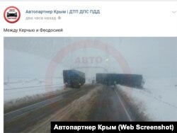 Наиболее сложная ситуация наблюдается на дорогах Крыма. Гололед и переметы способствуют созданию аварийных ситуаций. Одна из них произошла 8 января на трассе между Керчью и Феодосией, фото обнародовали очевидцы в группе «Автопартнер Крым» в соцсети «ВКонтакте».