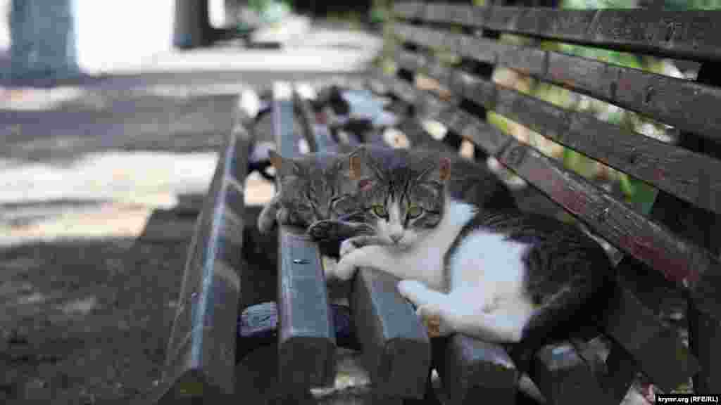 Местные коты отдыхают на лавочке у Карадагской биостанции в селе Курортное.