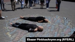 Участники акции нарисовали на асфальте карту Крыма, в центре написали «Сенцов», а вокруг него имена других политических заключенных, удерживаемых в России.