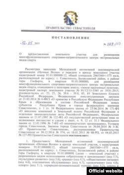 Российское правительство Севастополя выделило Молодежной автономной некоммерческой организации «Ночные волки» земельный участок под размещение «многофункционального спортивно-патриотического центра экстремальных видов спорта».