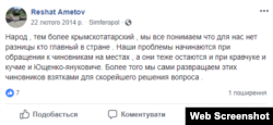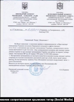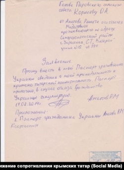 Когда Халилов говорит о документах, то имеет в виду заявление председателю Перовского сельсовета Корнееву, которое он после исчезновения Решата разместил в фейсбук-группе «Движение сопротивления крымских татар». В документе Аметов просит внести в его паспорт сведения о принадлежности к крымскотатарской национальности. В случае отказа он обещает аннулировать гражданство Украины.