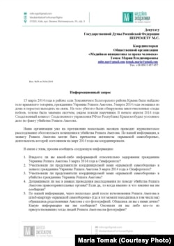 «Способ убийства Решата Аметова и обстоятельства, которые ему предшествовали, дают основания утверждать, что похищение, лишение свободы, пытки и лишение жизни крымского активиста жестоким способом связано с оккупацией Крыма. Это означает, что убийство Аметова следует квалифицировать не как бытовое, а именно как военное преступление, ведь оккупация Российской Федерацией украинского Крыма по праву вооруженных конфликтов (международному гуманитарному праву) равна военному конфликту.