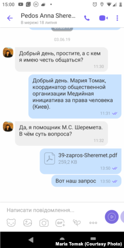 Мы обратились с запросом к Михаилу Шеремету (который в Украине находится в розыске) о том, известно ли ему что-нибудь об обстоятельствах исчезновения Решата Аметова и о причастности к этому подконтрольных ему вооруженных формирований. После направленного в Фейсбуке запроса (других официальных контактов найти сначала не удалось) ответа не получили. Далее мы обратились к его помощникам ‒ один из адресатов, Анна Педос, подтвердила, что является помощницей Шеремета, но ответа на запрос не предоставила.